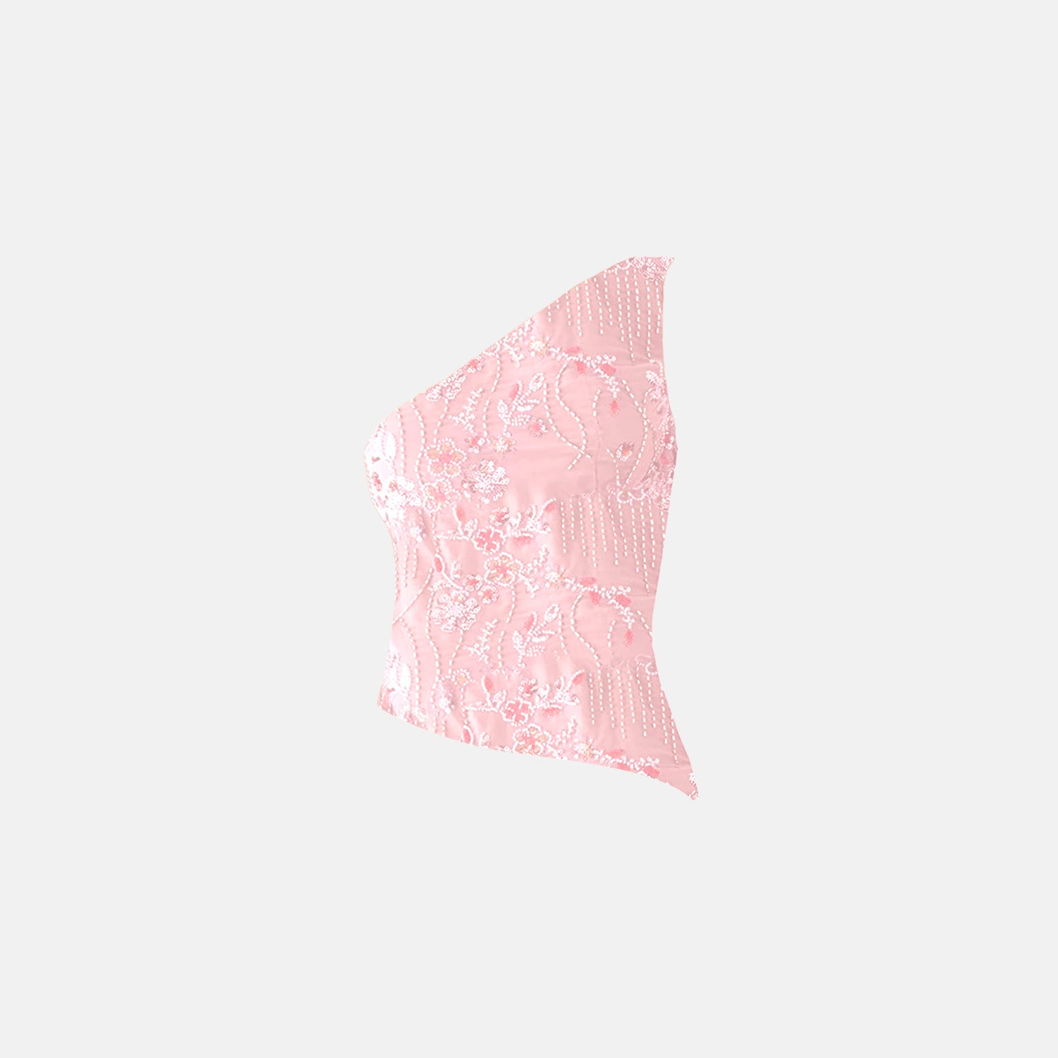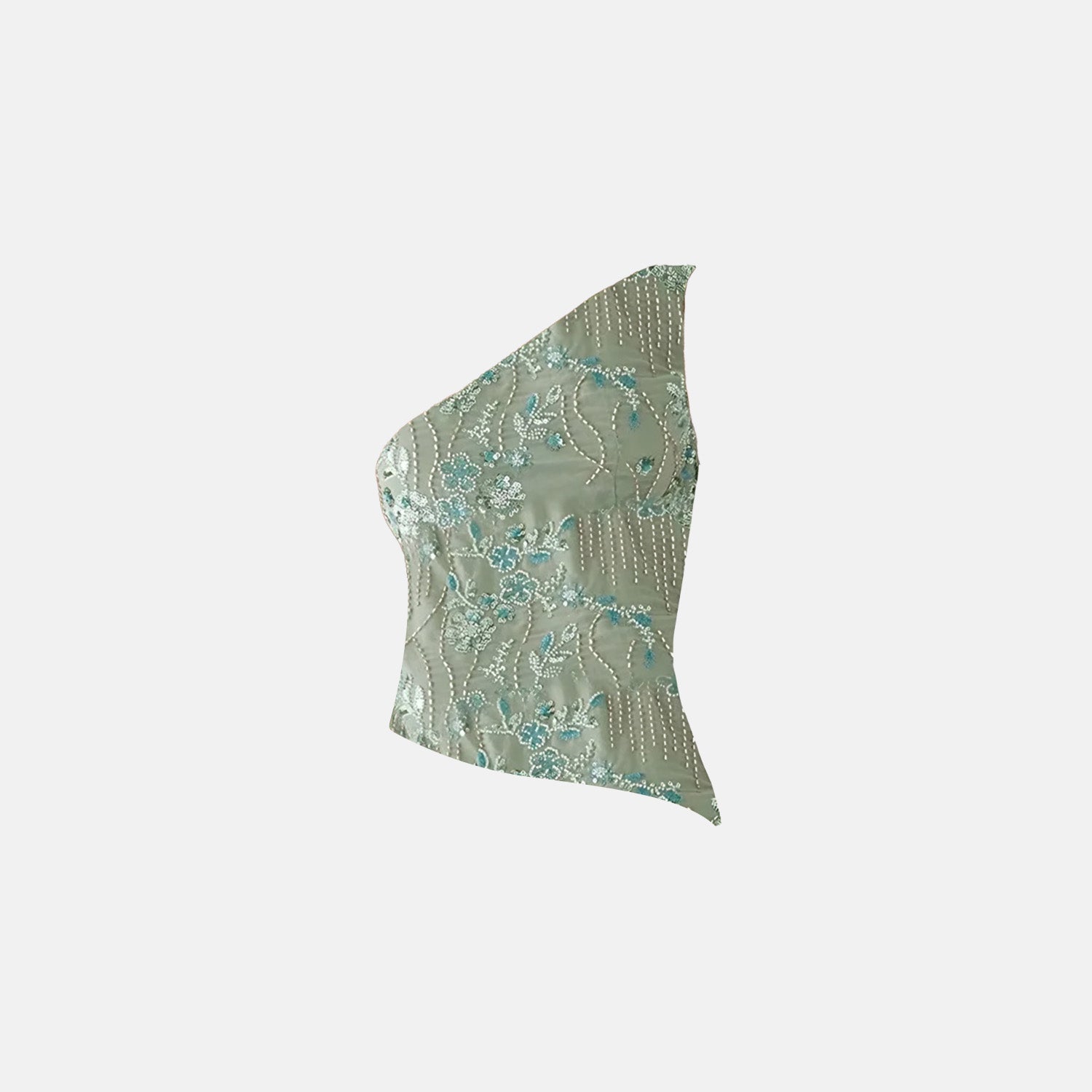Blusa de um ombro só, modelagem ajustada ao corpo, tule bordado com paetês e miçangas, detalhe floral aplicado e acabamento interno forrado.