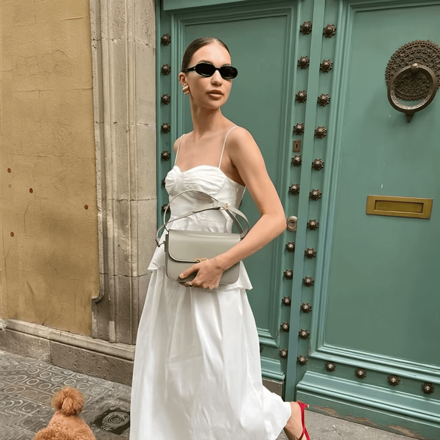 Blusa de alças finas ajustáveis. Decote reto com detalhe franzido na frente. Bainha assimétrica com camada peplum. Acabamento em costura reforçada.