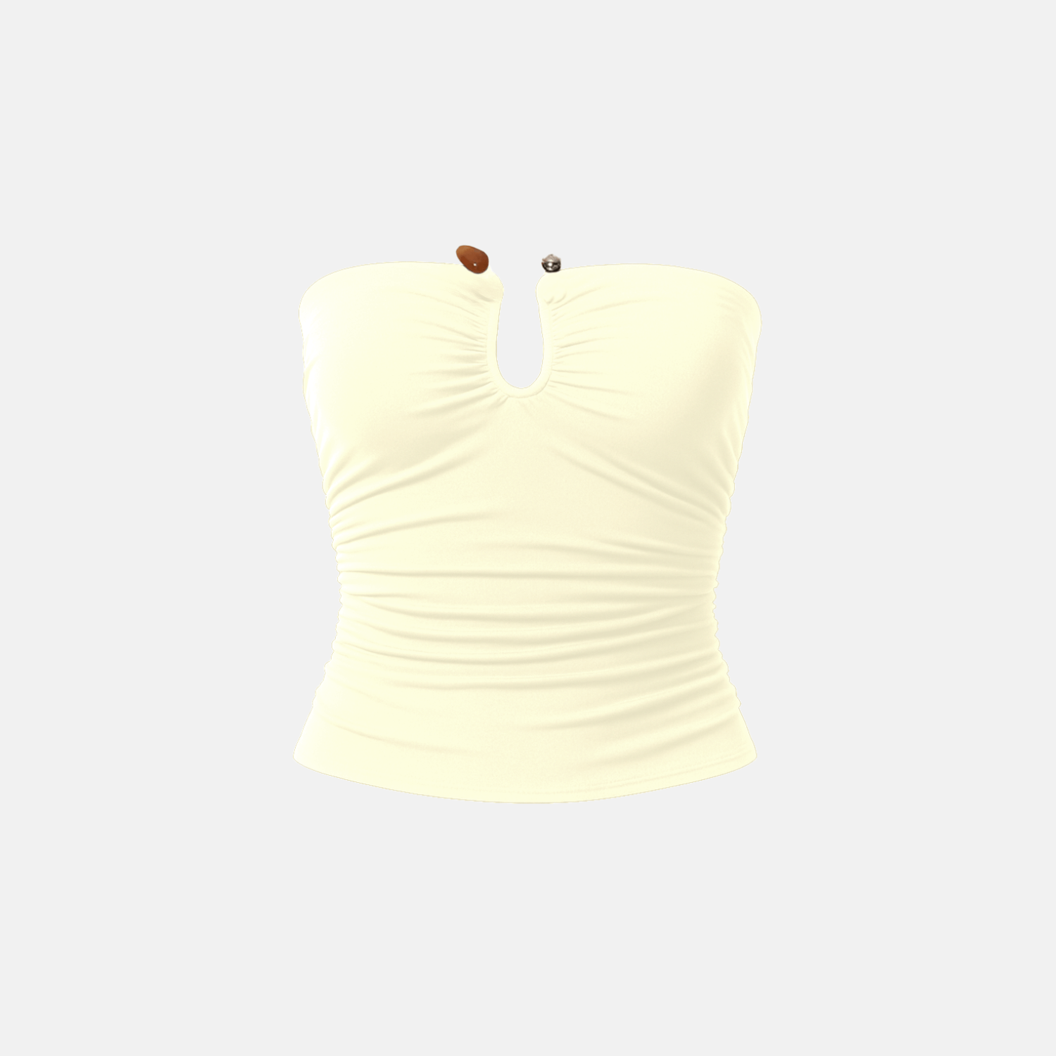 Blusa tomara que caia com franzido frontal e recorte em gota. Detalhe de pingentes metálicos no busto. Modelagem ajustada com drapeado em toda a peça e costura embutida.
