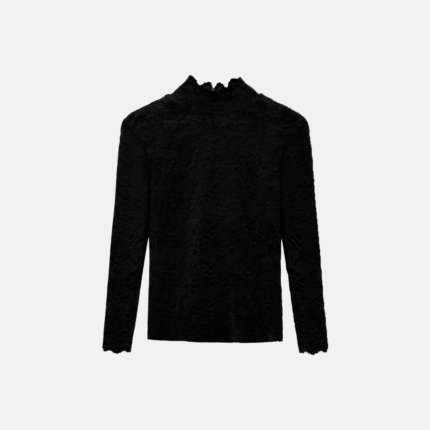 Blusa de manga longa em renda com padrão paisley. Gola alta com acabamento delicado e punhos recortados. Tecido com textura macia e ajuste confortável.