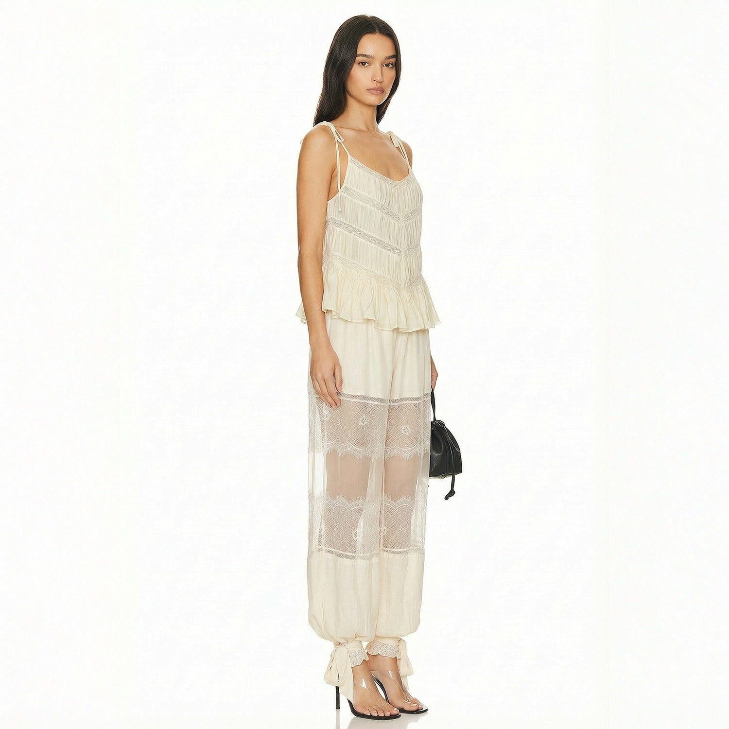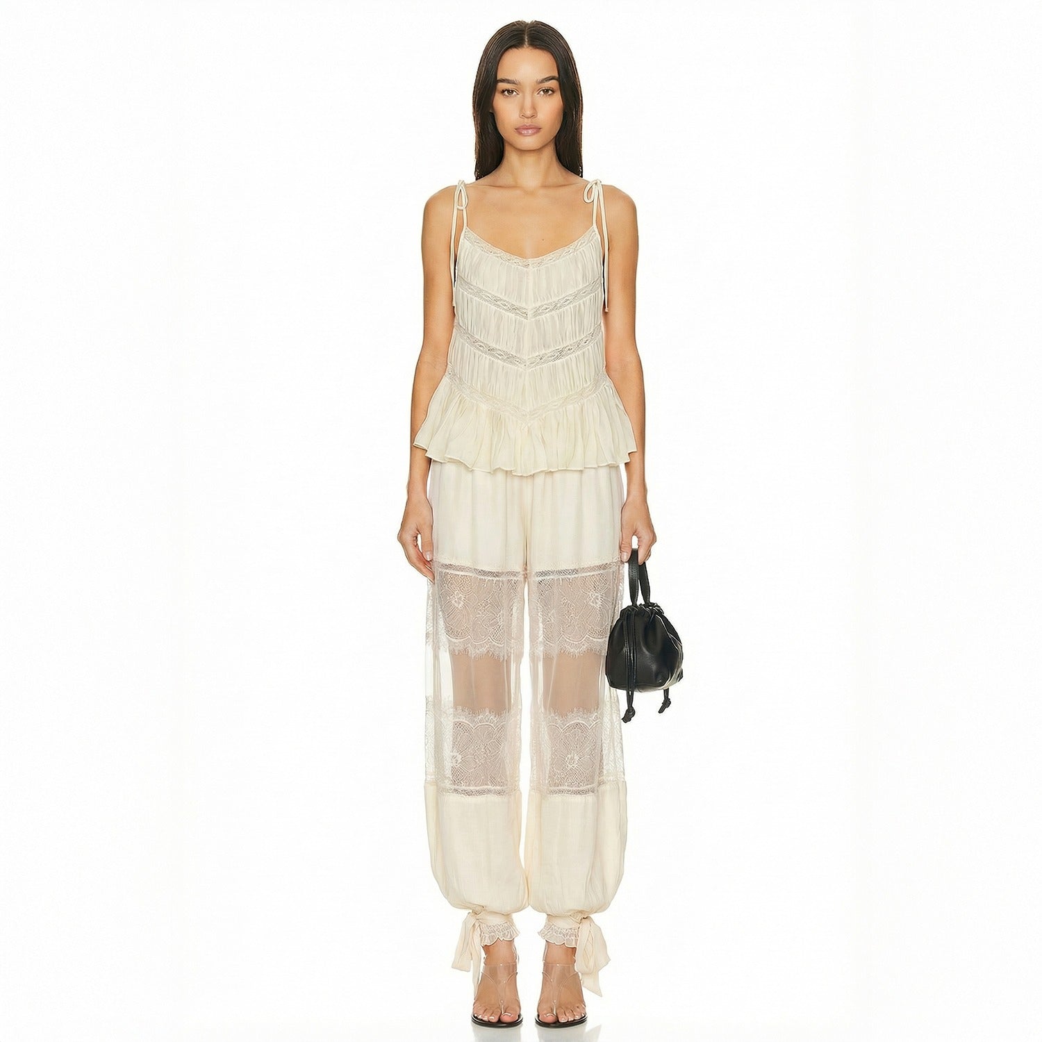 Calça com renda e área trasparente nos joelhos. Detalhes de renda