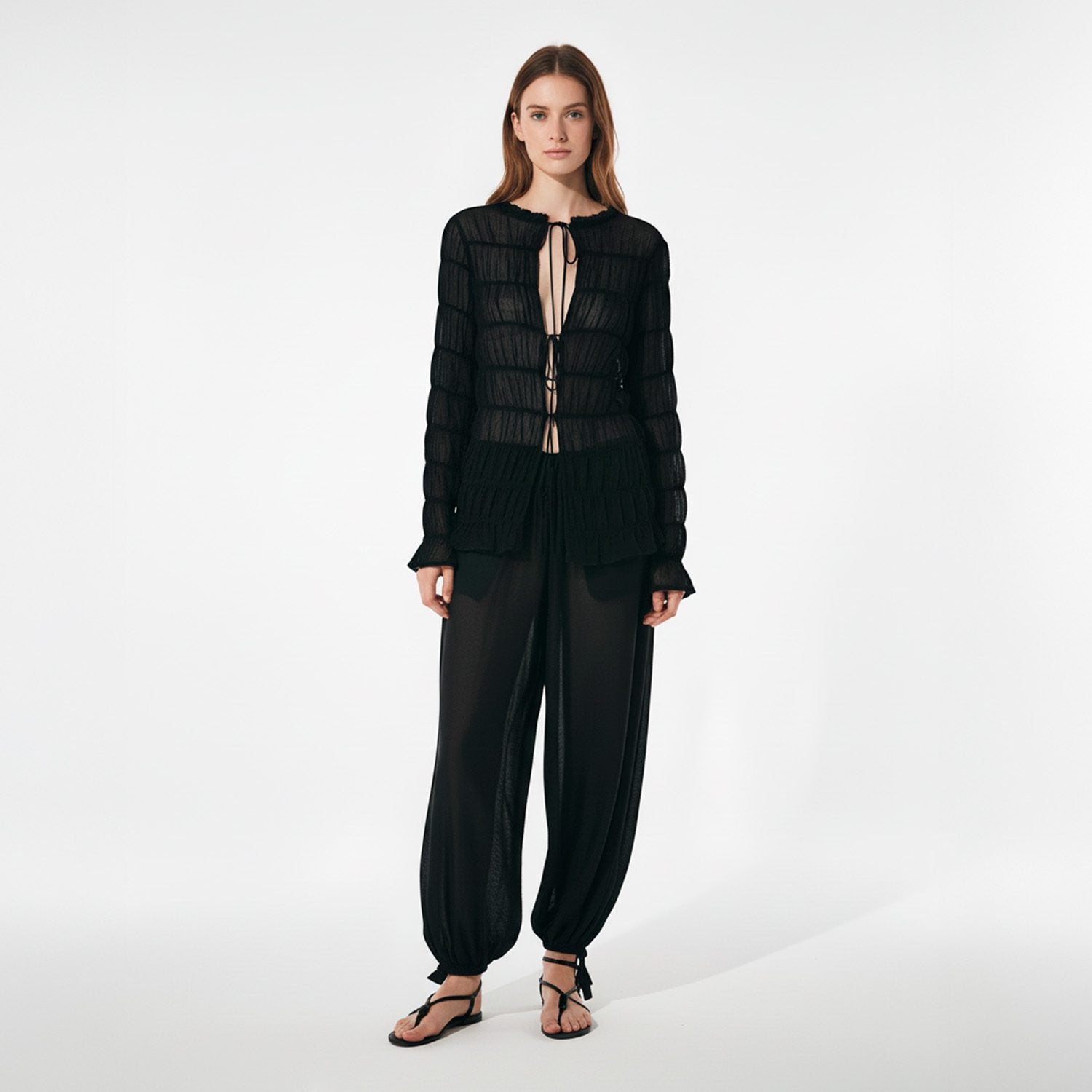 Calça solta de cintura média com caimento leve. Barra ajustada com elástico e laços decorativos nas laterais. Tecido translúcido de efeito fluido. Cós elástico reforçado e acabamento em costura discreta.