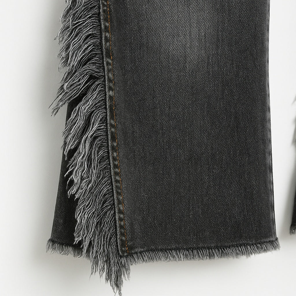 Calça flare de cintura alta. Jeans preto com lavagem suave e acabamento acetinado. Franjas longas aplicadas nas laterais das pernas. Bolsos frontais e traseiros com costura contrastante. Fecho frontal em zíper e botão metálico.
