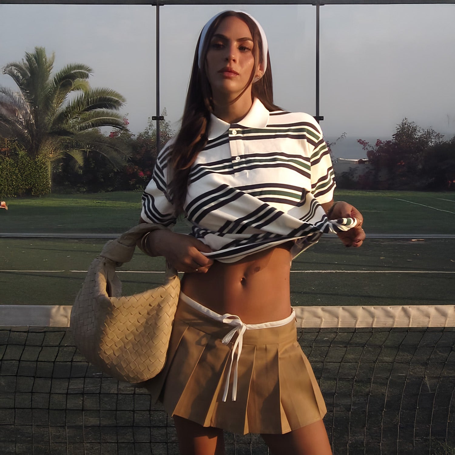 Camisa polo oversized com mangas curtas e estampa listrada. Gola tradicional com abertura em botões. Acabamento canelado nas mangas e barra reta..