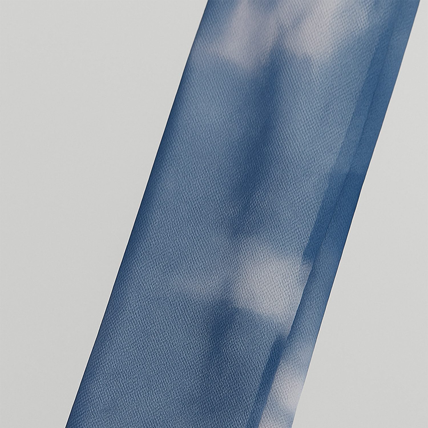 Blusa manga longa ajustável. Tecido transparente tie-dye azul e branco. Ilhoses metálicos com amarrações cruzadas. Gola alta com estampa em letras pretas.