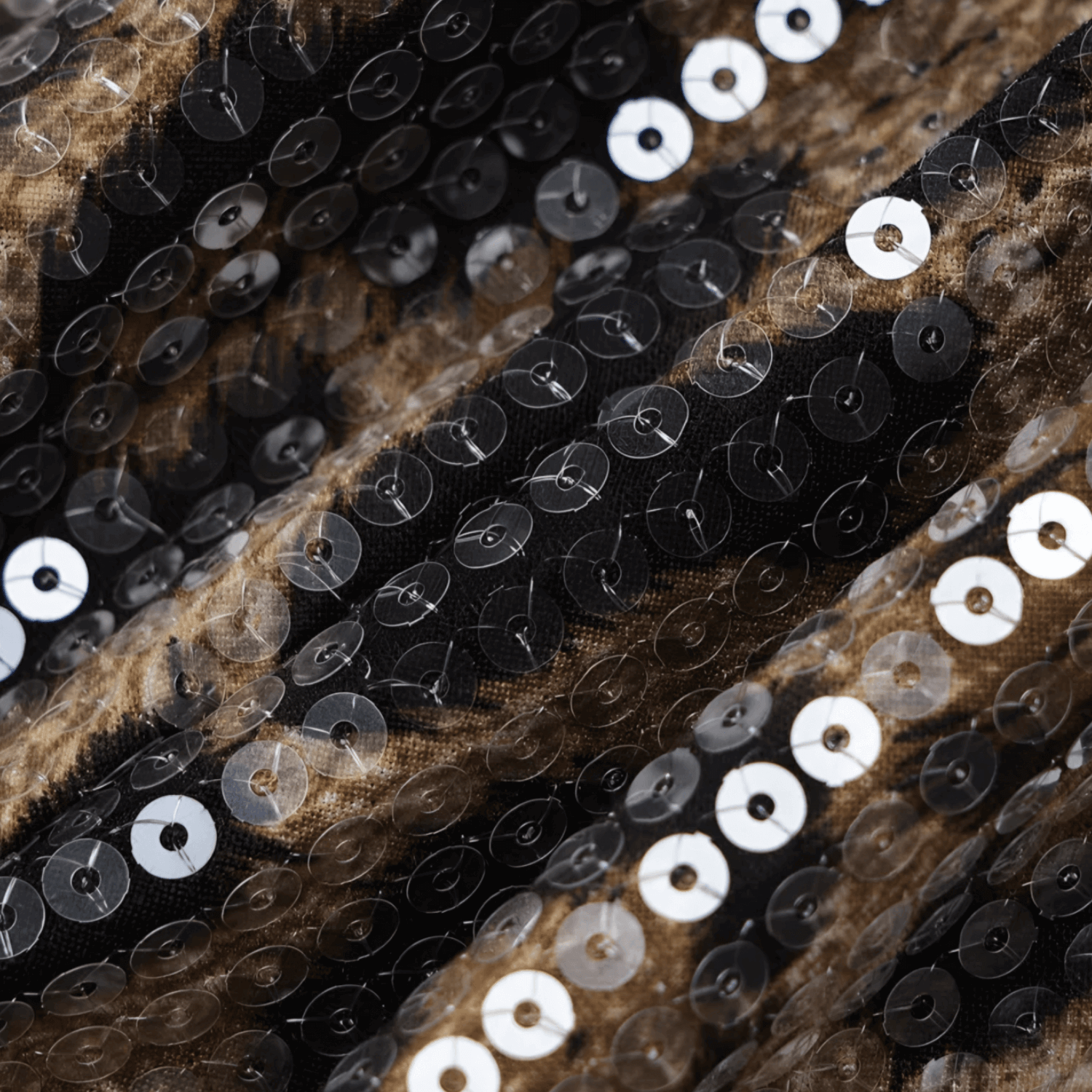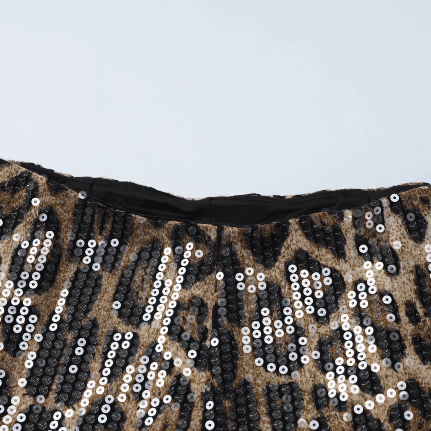Short curto ajustado com estampa de oncinha. Superfície coberta por lantejoulas verticais. Cós interno elástico e acabamento forrado com costura embutida.
