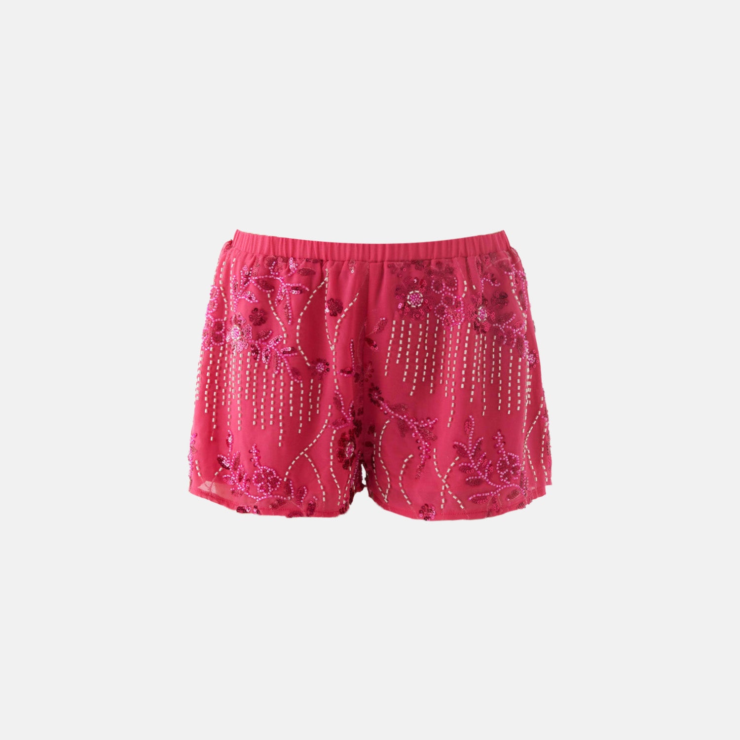 Shorts soltinho com cintura média, tule bordado com paetês e miçangas, aplicação floral, elástico embutido na cintura e acabamento forrado.