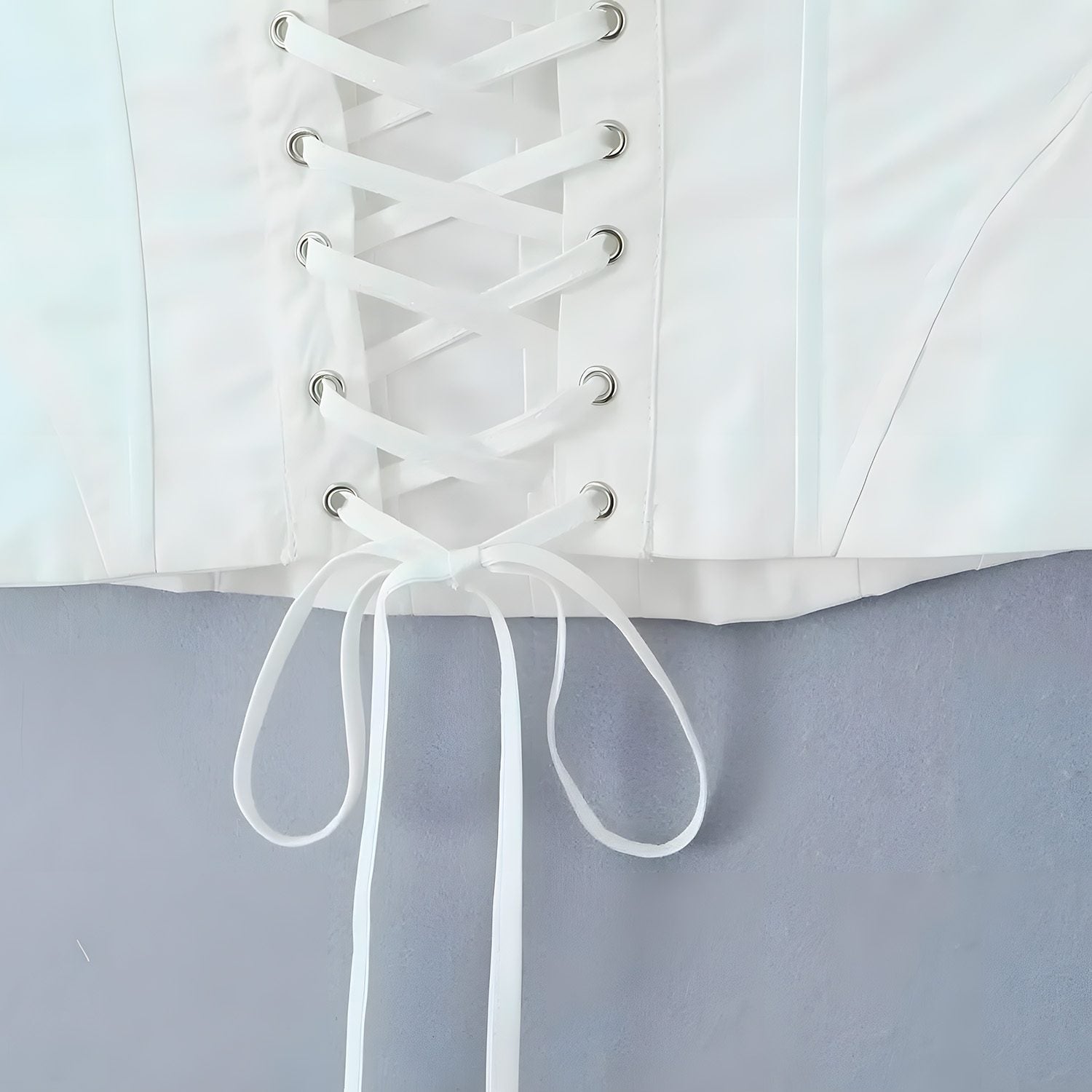 Top estruturado sem alças com bojo marcado. Costuras verticais aparentes que valorizam a modelagem. Parte traseira com amarração ajustável em ilhós metálicos. Acabamento interno reforçado e tecido liso de leve brilho.
