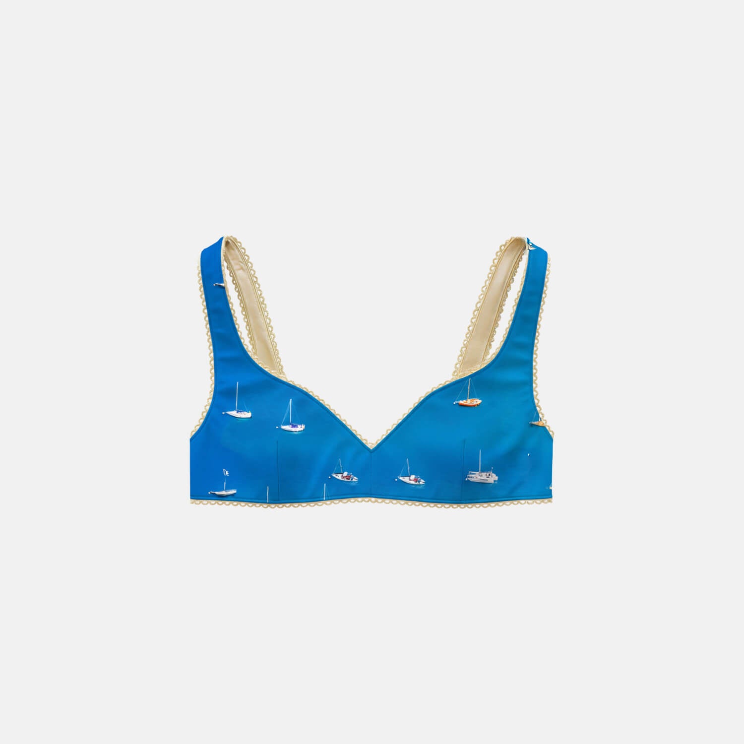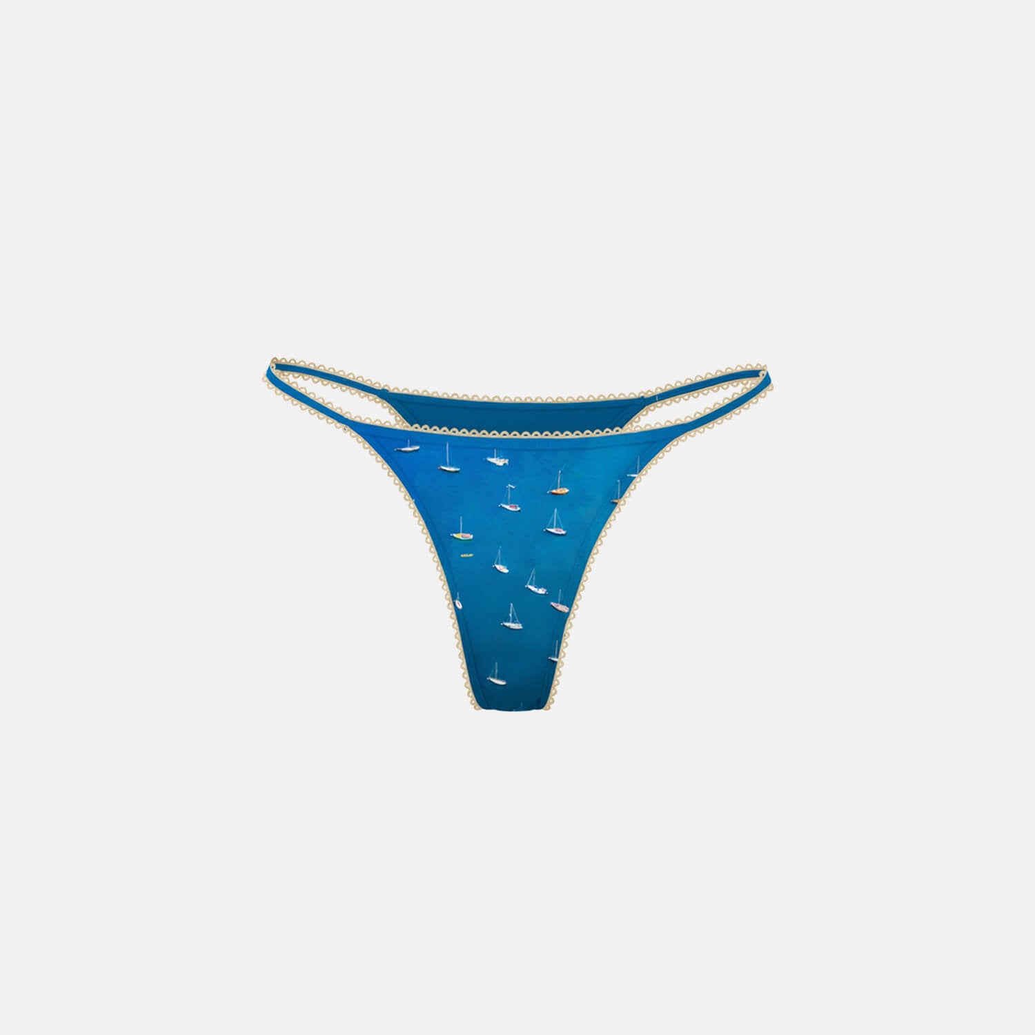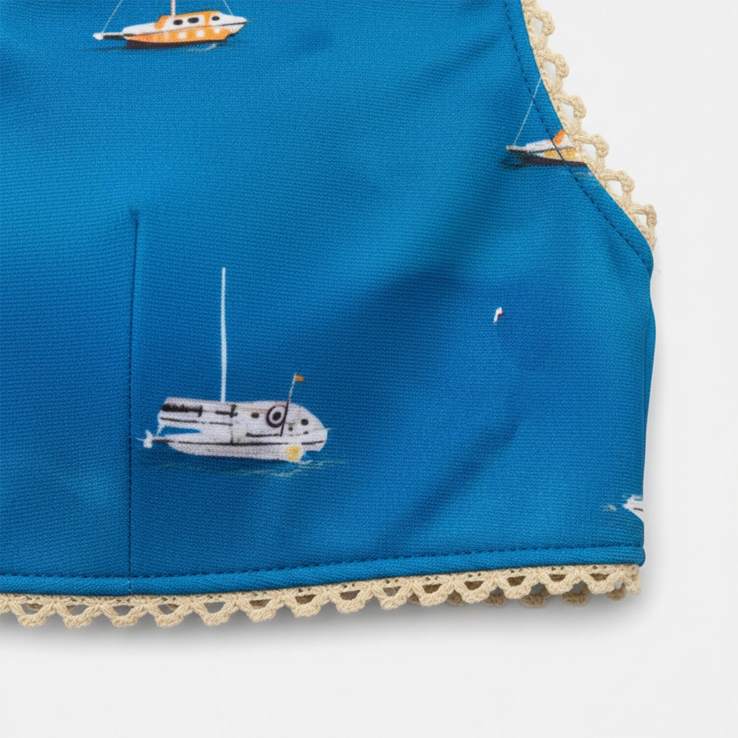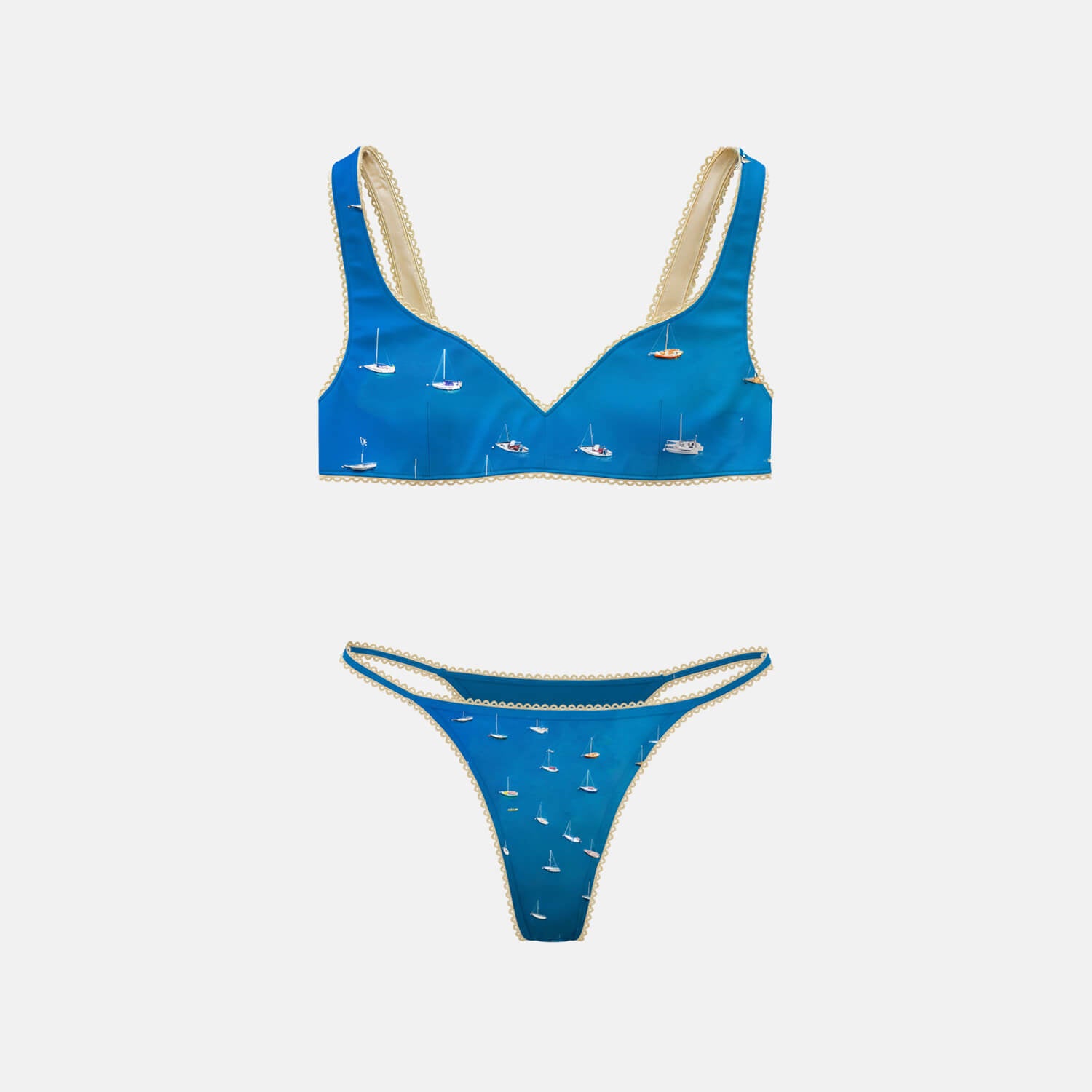 Biquíni com estampa artística inspirada em barcos vistos do alto. Top estruturado com aro e alças ajustáveis, oferecendo sustentação e conforto. Calcinha modelo tanga com laterais finas e cobertura média. Confeccionado em tecido de toque macio e secagem rápida.