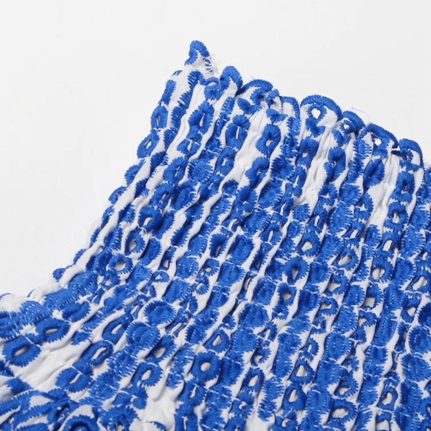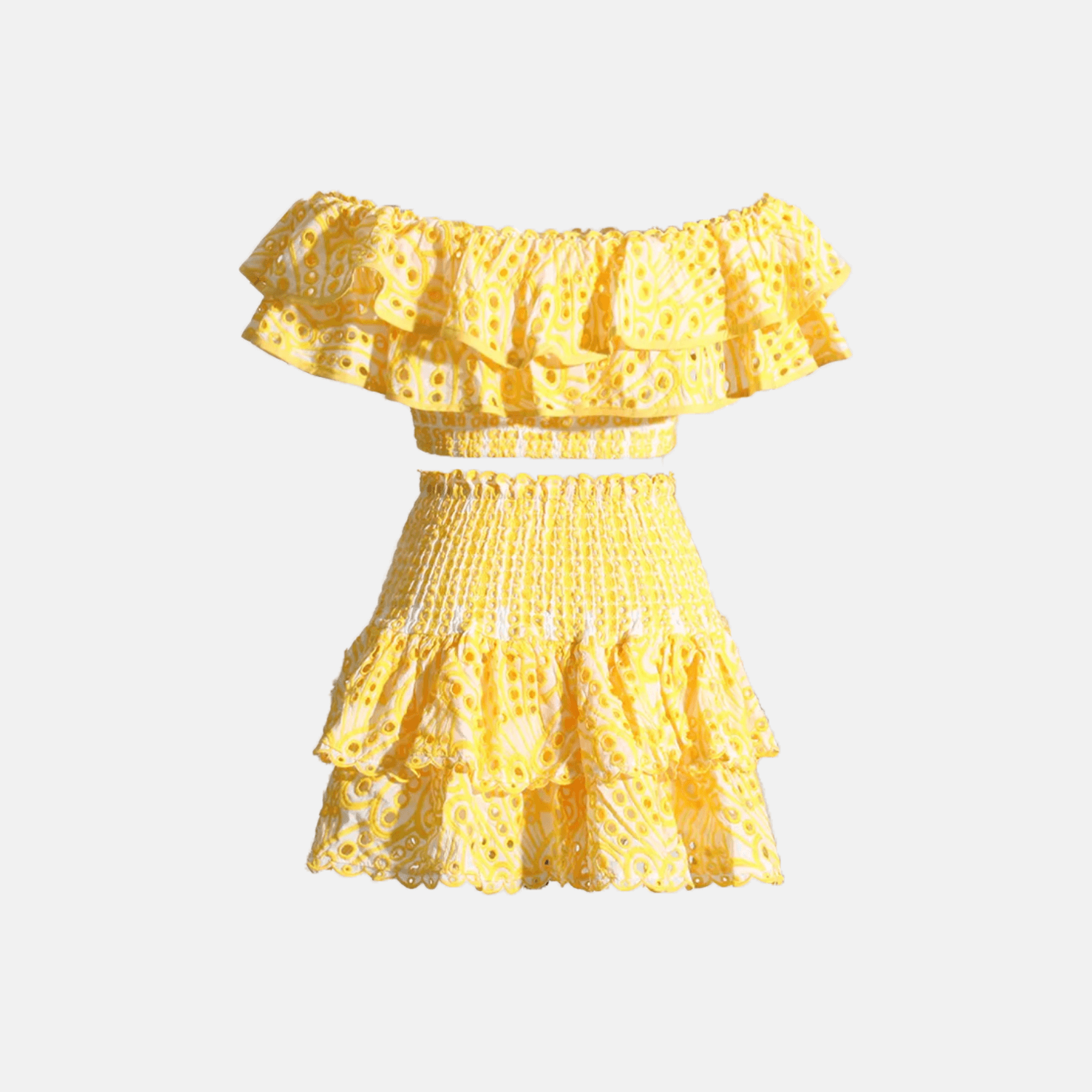 Conjunto de top e saia com detalhes franjados. Top ombro a ombro com babados. Saia de cintura alta com babados e cós elástico.