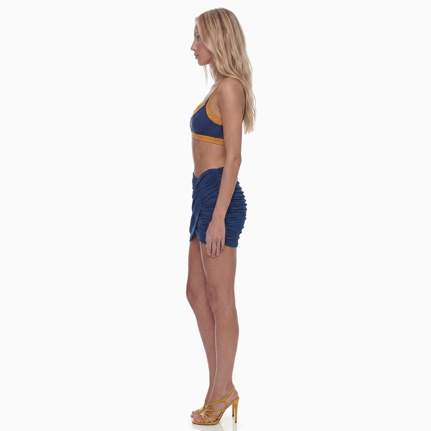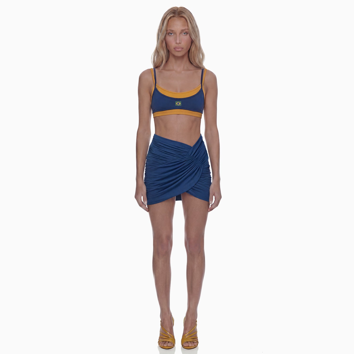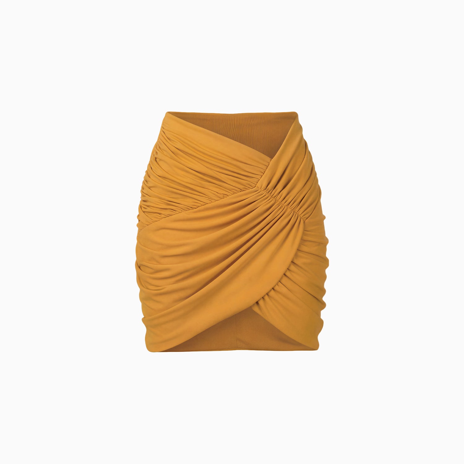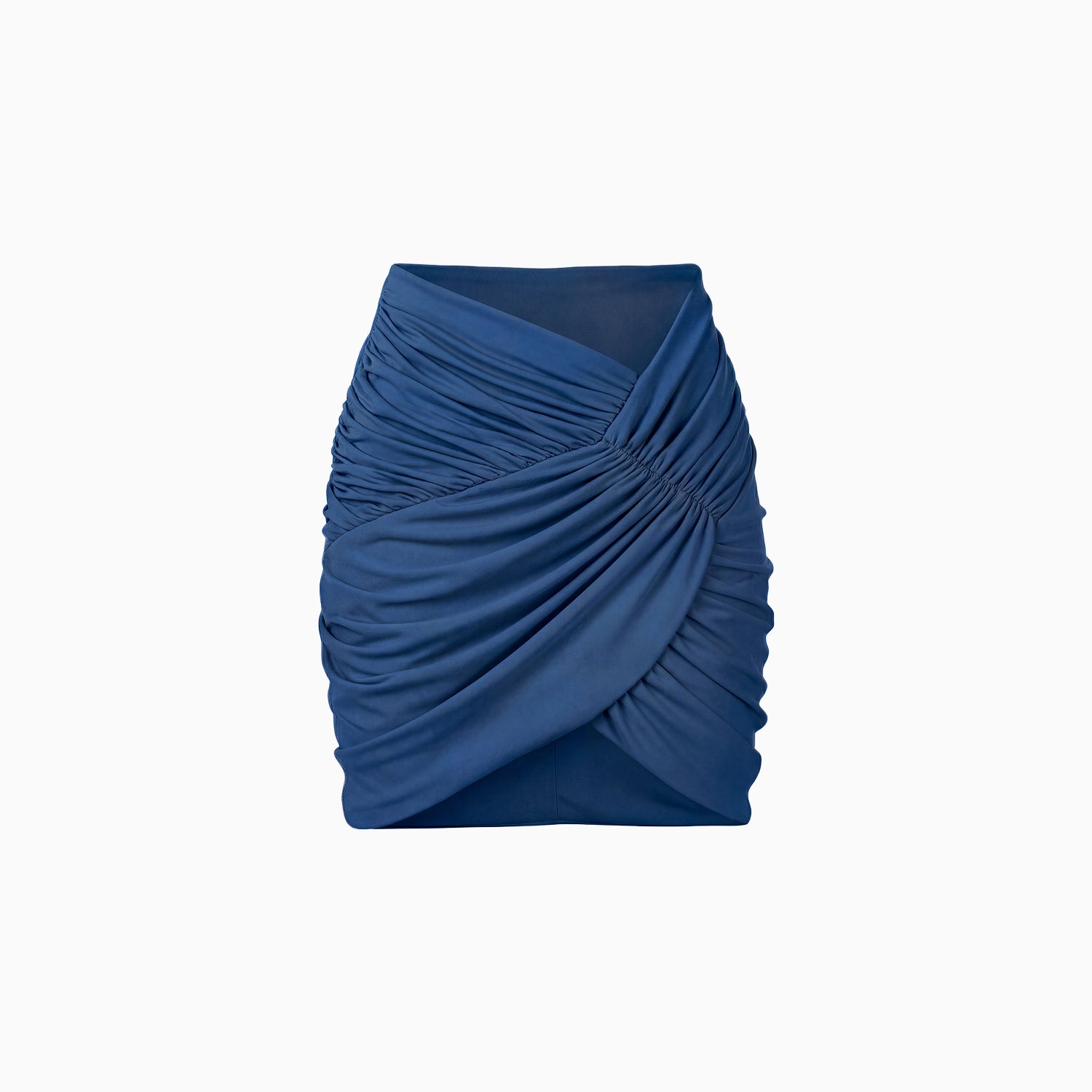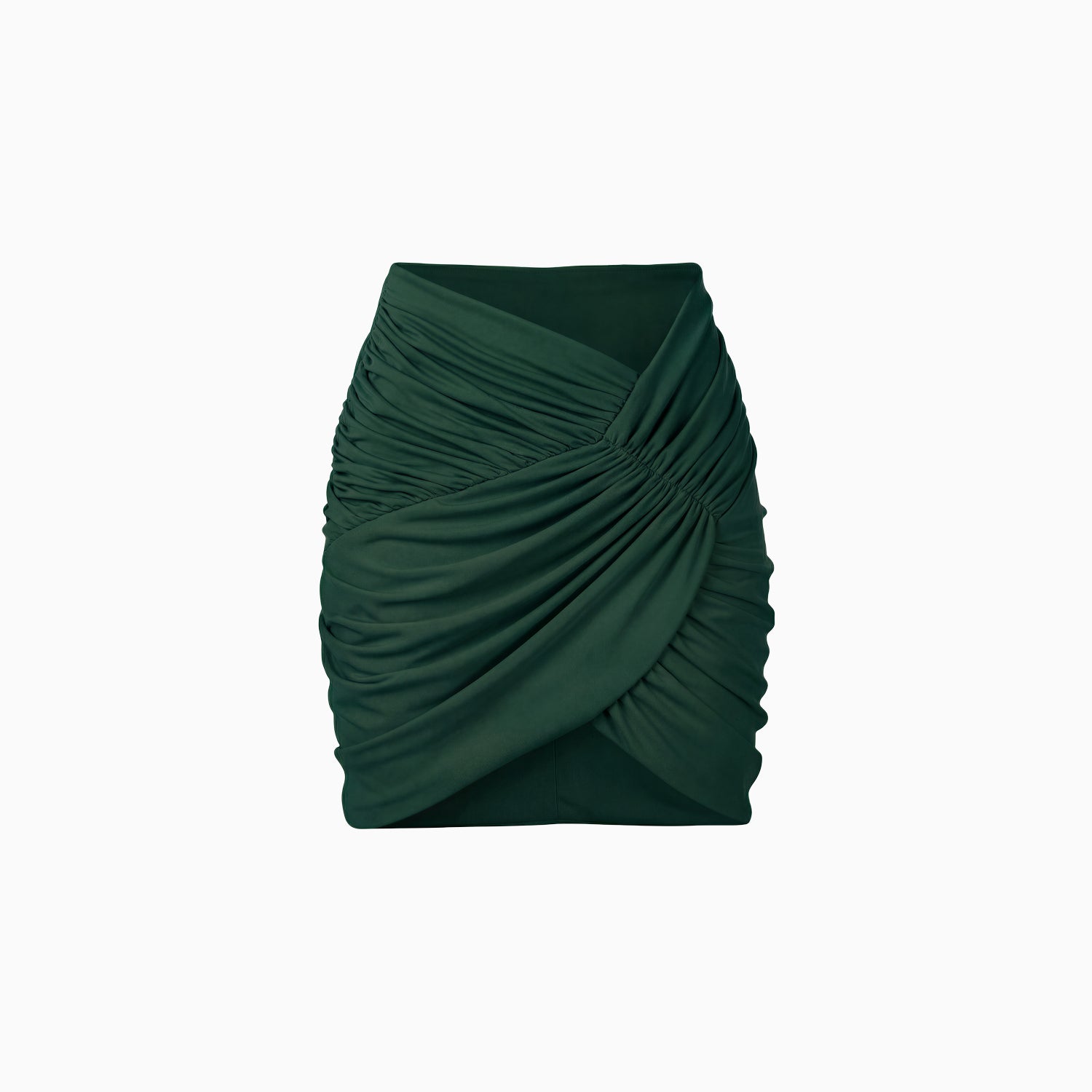 Saia curta de cintura média com modelagem ajustada. Estrutura com drapeados frontais cruzados. Design assimétrico com efeito envelope. Acabamento em costuras discretas e caimento estruturado.