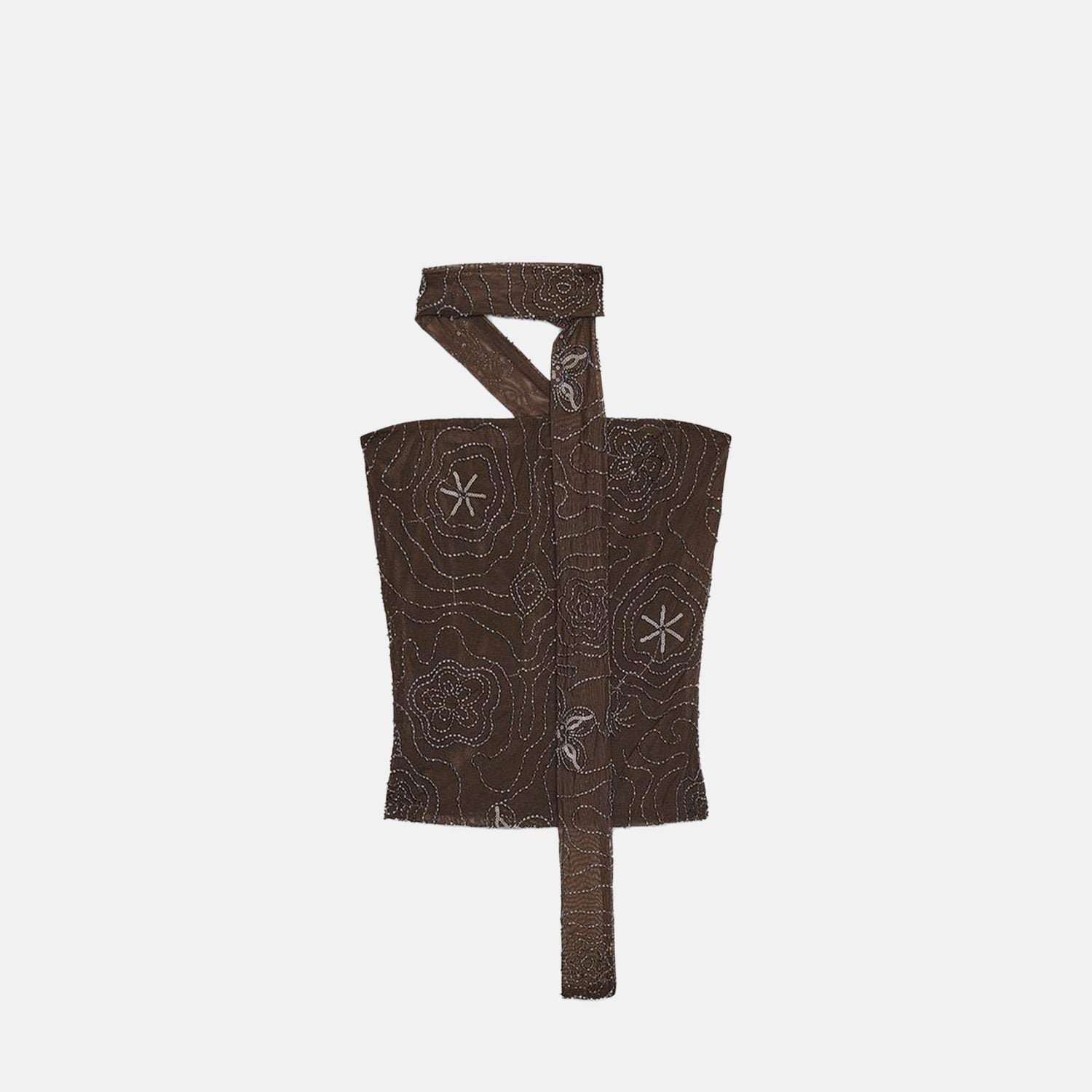 Top sem alças com modelagem reta ajustada. Alça assimétrica longa presa ao decote que pode ser usada como detalhe de amarração. Bordados florais e geométricos em pedrarias metálicas. Tecido translúcido estruturado com acabamento em costura reforçada.